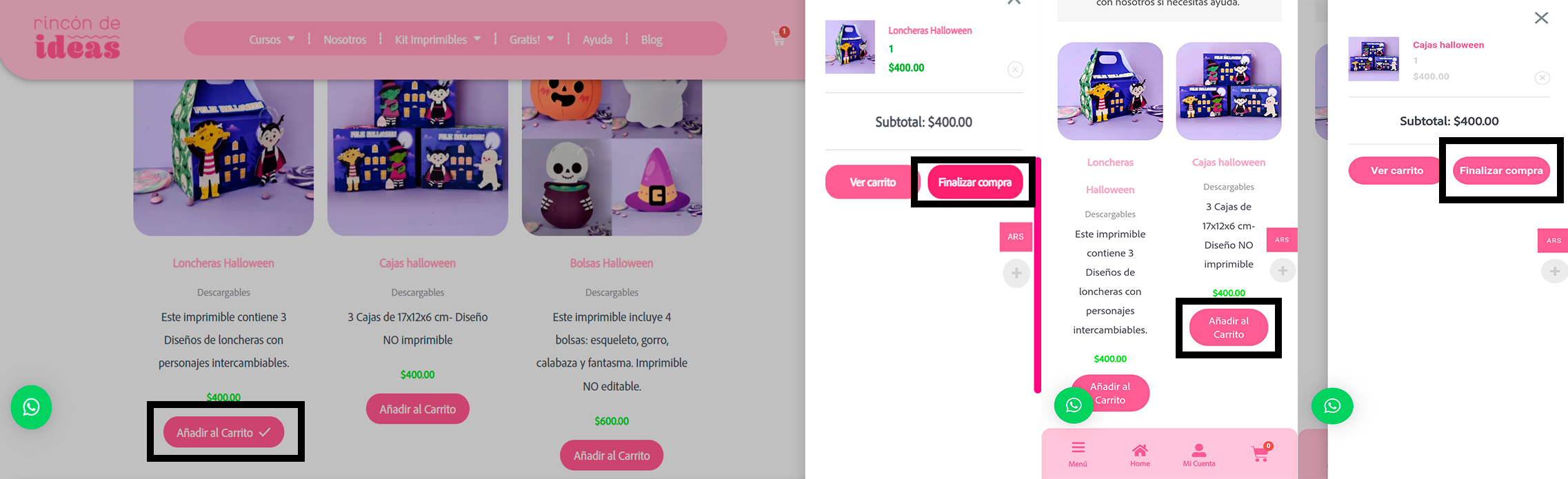 Tanto desde la pc como del celular elegi los kits imprimibles que queres y añadilos al carrito, una vez listo hace click en finalizar la compra (Podes añadir todos los cursos que quieras)
