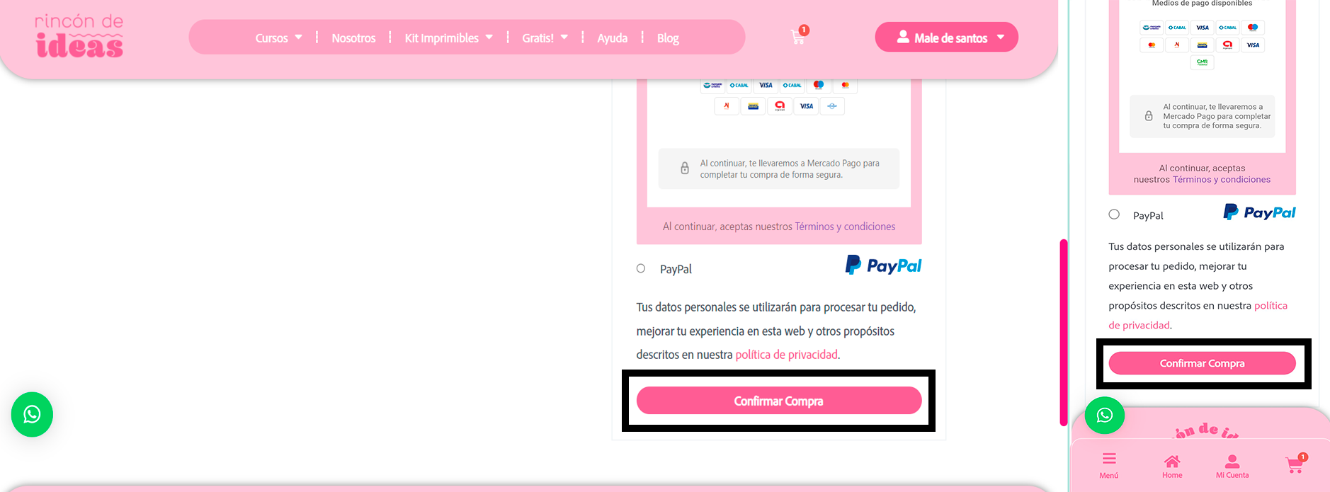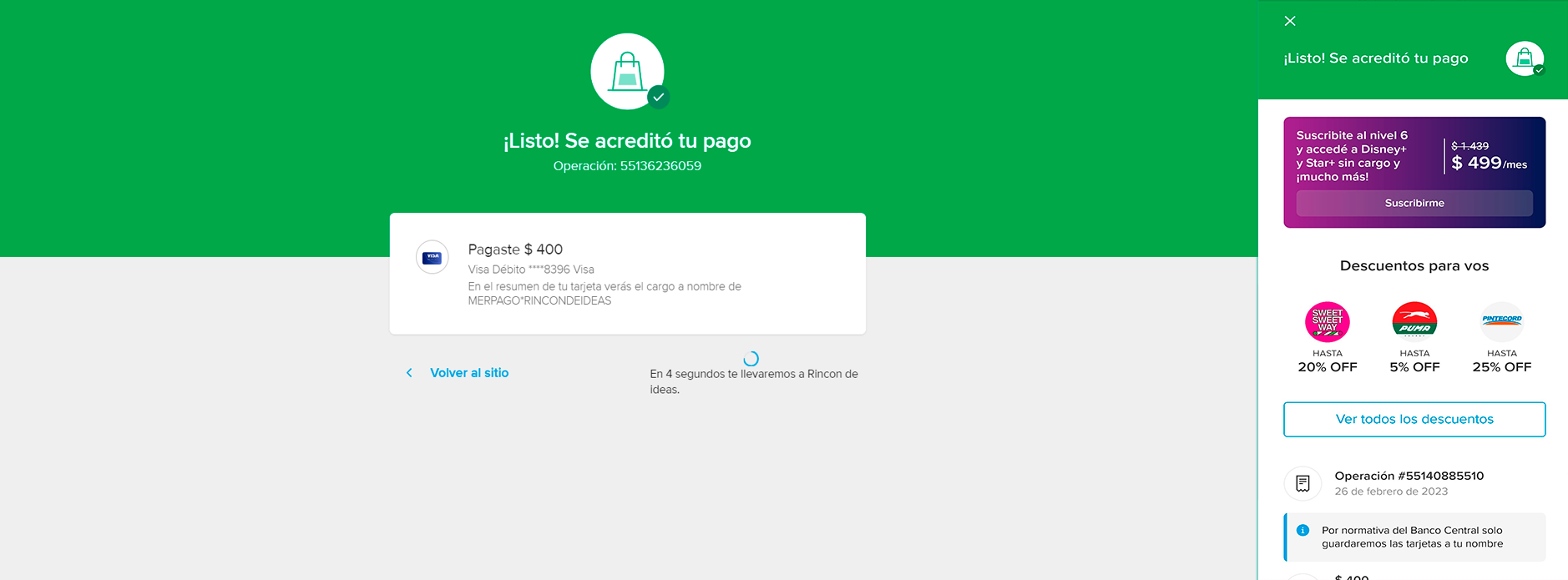 Una vez acreditado el pago, sea el medio que sea espera unos segundos que te redirige nuevamente a nuestra pagina web 🥰 (En el caso de tener algun error durante este proceso enviame un mensaje por whatsapp asi podemos ayudarte mas rapido) Ir al whatsapp de Rincon de ideas