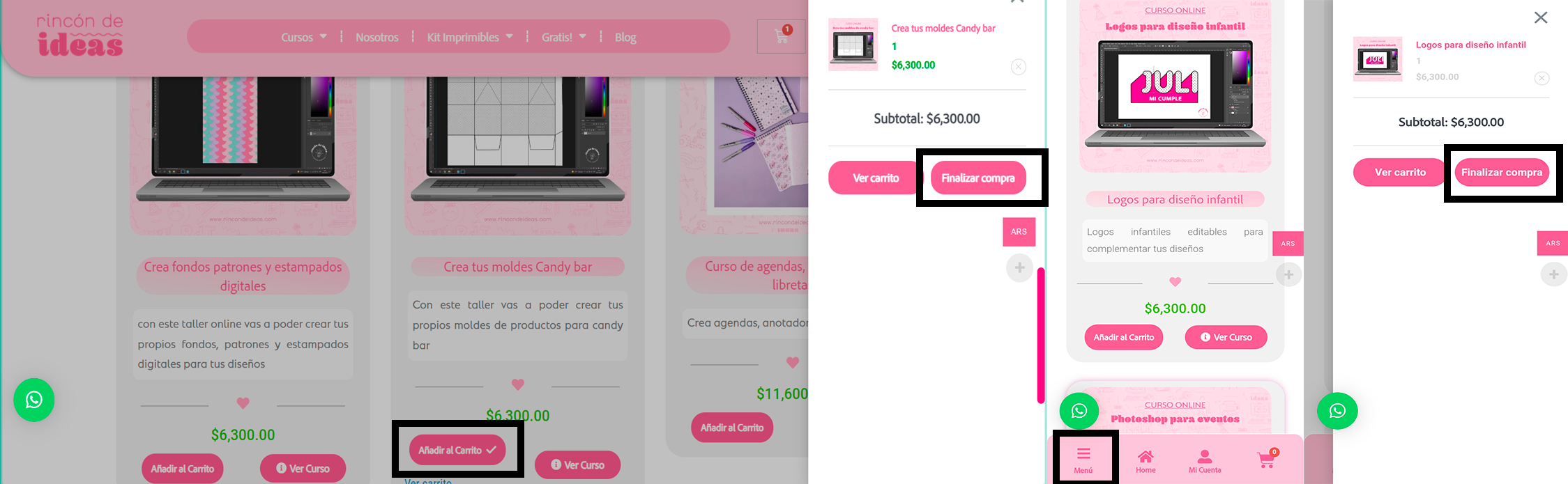 Tanto desde la pc como del celular elegi los cursos que queres y añadilos al carrito, una vez listo hace click en finalizar la compra (Podes añadir todos los cursos que quieras)