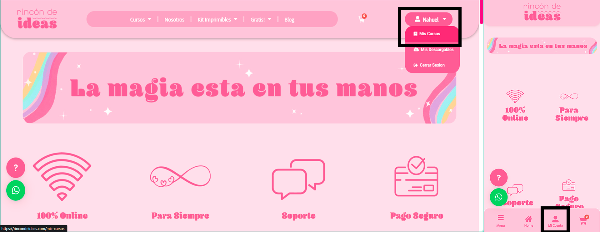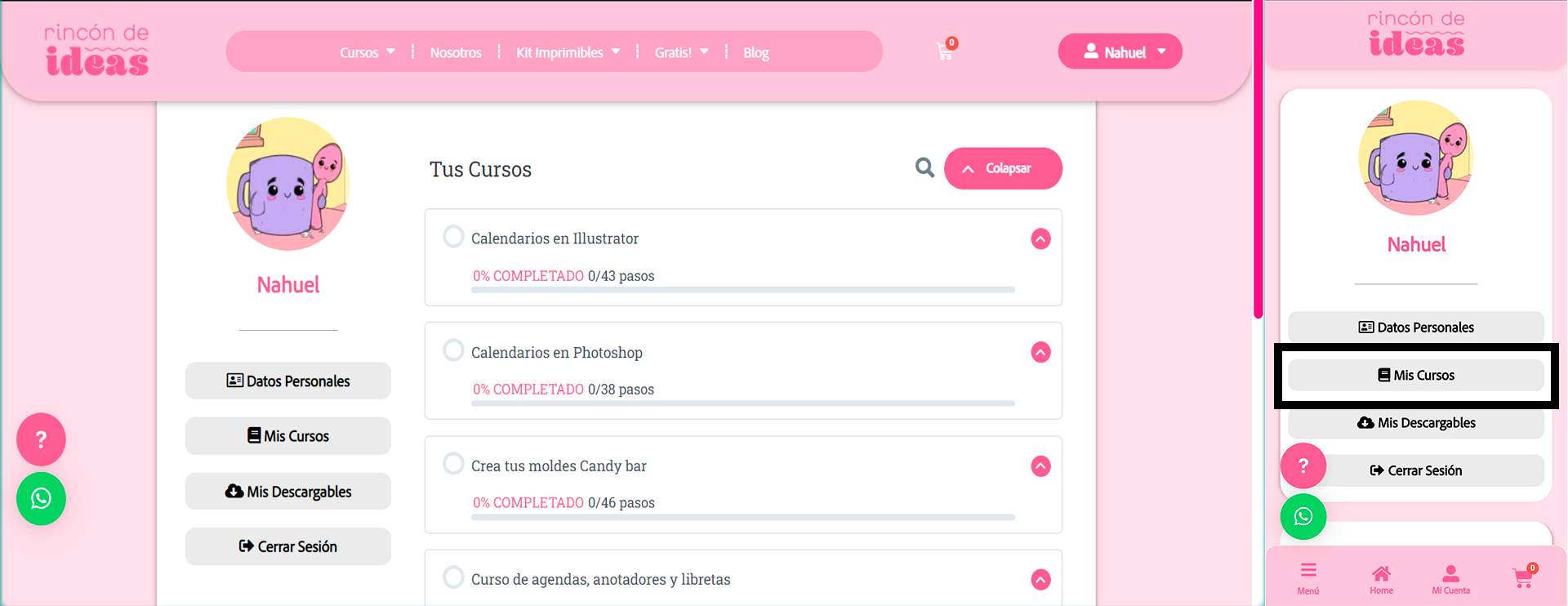 Una vez que compraste un curso dentro de nuestra pagina web dirigite a tu perfil. Si estas en la pc ingresas en la parte superior derecha de la web donde aparece tu nombre de usuario y hace click en mis cursos. Si estas en tu celular dirigite a la parte baja de la web donde dice “Mi cuenta”.