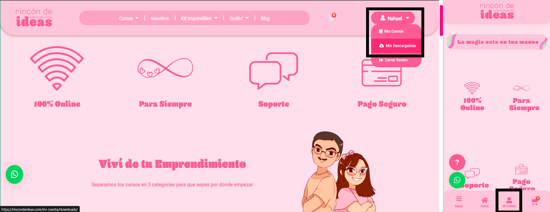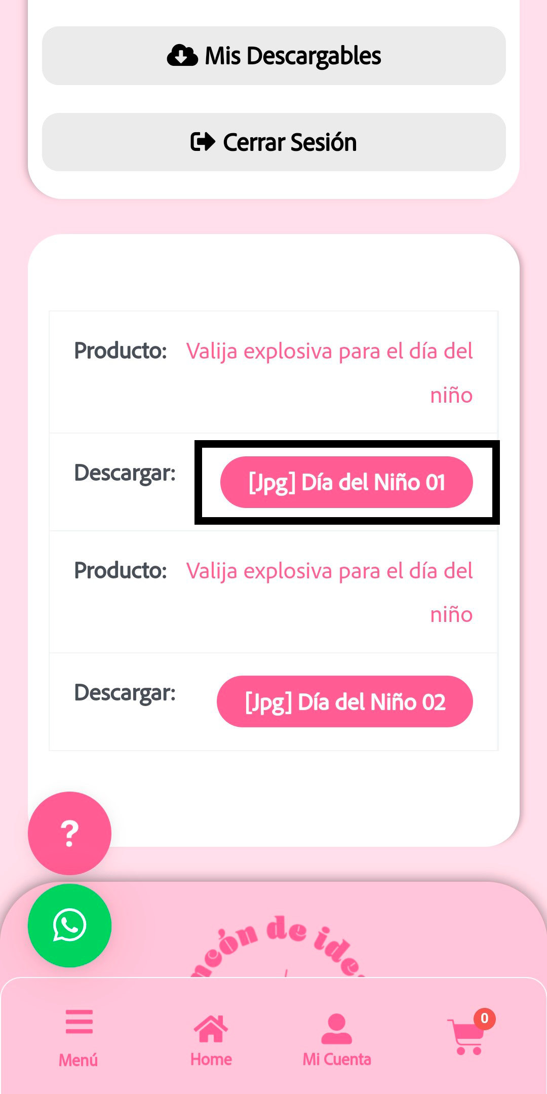 Una vez que compraste un kit imprimible dentro de nuestra pagina web dirigite a tu perfil. Si estas en la pc ingresas en la parte superior derecha de la web donde aparece tu nombre de usuario y hace click en mis descargables. Si estas en tu celular dirigite a la parte baja de la web donde dice “Mi cuenta”.